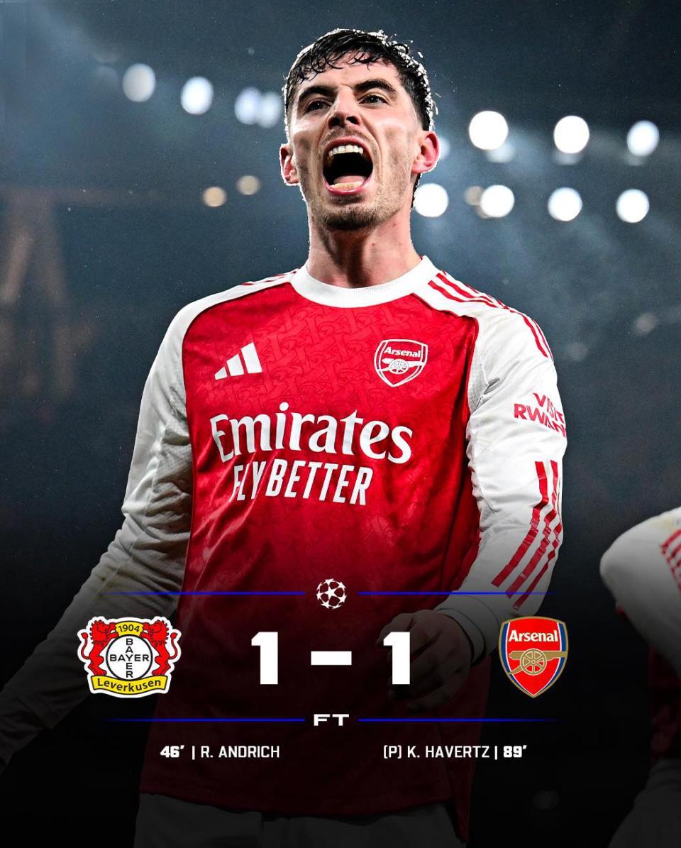哈弗茨主罚一蹴而就,阿森纳1-1惊险绝平对手,也为次回合加归主场占得先机。
